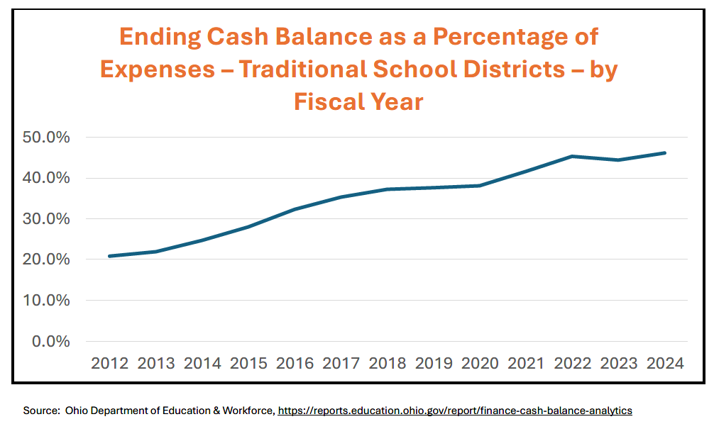 While much of Ohio’s property tax system funds school districts, the proposed reforms will not impact current school revenues.  Rather, the reforms would merely tamp down the rate of increase in real property taxes—taxes may still increase, but at a substantially slower rate, thereby protecting both taxpayers and school districts.  Data from the Ohio Department of Education & Workforce shows that school district ending cash balances have nearly doubled over the last 14 years and, on average, cover over 45% of school district annual expenses (see following chart).